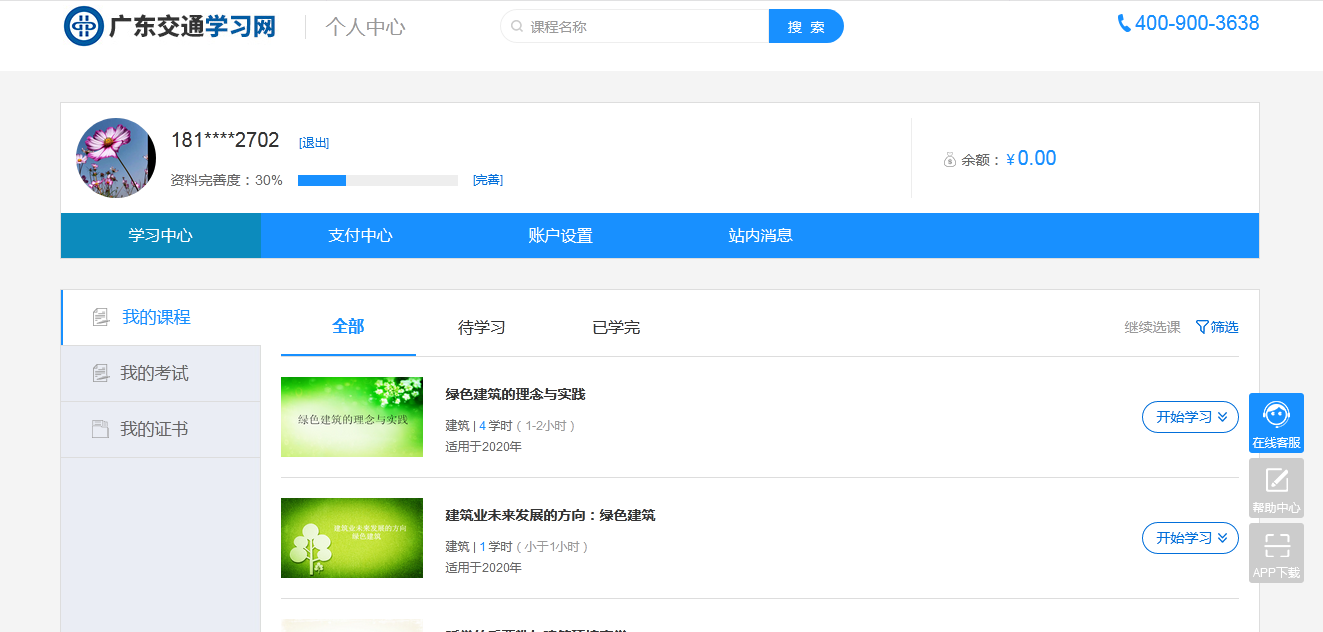 首先进入到“个人中心”->“学习中心”,在“我的课程”中可以选择查看“已购买”课程。